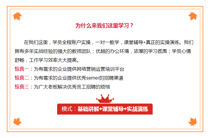 驚喜一:為有需求的企業(yè)提供網(wǎng)絡(luò )營(yíng)銷(xiāo)運營(yíng)培訓平臺